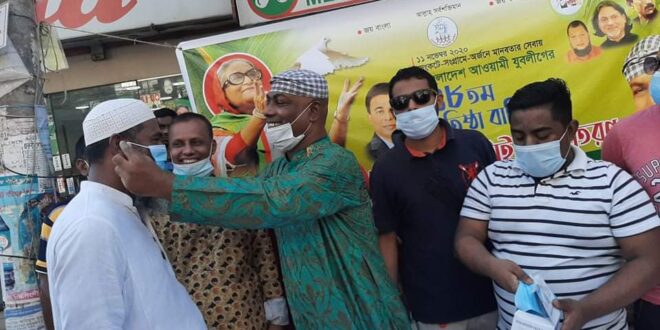 সংকটে,সংগ্রামে অর্জনে মানবেতর সেবায় যুবলীগ এই প্রতিপাদ্য বাস্তবায়নে এবার প্রতিষ্ঠা বার্ষিকীতে যুবলীগ কে সাধারণ মানুষের কল্যাণের সংগঠনে পরিণত করতে চলনান করোনা পরিস্থিতিতে করোনা সংক্রমণের ঝুকি এড়াতে জনসমাগম না করে, মাস্ক, হ্যান্ড স্যানিটাইজার বিতরণ করে করোনা থেকে মানুষকে রক্ষার মানবতার দৃষ্টান্ত তৈরী করেছেন ময়মনসিংহ জেলা যুবলীগের যুগ্ম আহবায়ক এইচ এম ফারুক। সকাল ১১টায় জেলা যুবলীগের পক্ষ থেকে ময়মনসিংহ নগরীর চড়পাড়া মোড়ে আওয়ামী যুবলীগের ৪৮তম প্রতিষ্ঠা বার্ষিকী উপলক্ষে বাংলার মহিয়সী নারী, উন্নয়নের রুপকার বঙ্গবন্ধু কন্যা দেশরত্ন শেখ হাসিনার নির্দেশে সংগঠনের সভাপতি শেখ ফজলে শামস পরশ এবং সাধারণ সম্পাদক মাইনুল হোসেন খান নিখিলের নেতৃত্বে চলমান মহামারী করোনা পরিস্থিতিতে করোনা সংক্রমণের দ্বিতীয় ওয়েব মোকাবেলায় জনগণের মাঝে জনসচেতনতা সৃষ্টির লক্ষে পথচারী ও সাধারণ মানুষের মাঝে বিনামূল্যে মাস্ক, হ্যান্ড স্যানিটাইজারসহ বিভিন্ন সুরক্ষা সামগ্রী বিতরন করেন ময়মনসিংহ জেলা আওয়ামী যুবলীগের যুগ্ম আহবায়ক এইচ এম ফারুক।