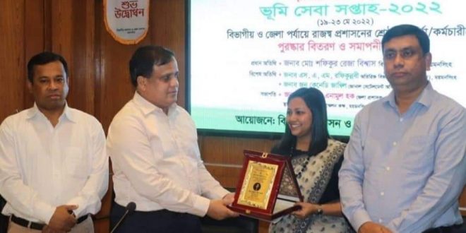 ময়মনসিংহ জেলায় রাজস্ব প্রশাসনের শ্রেষ্ঠ কর্মকর্তা হিসাবে পুরস্কার আর সার্টিফিকেট প্রদান করা হয়েছে তারাকান্দা উপজেলার সহকারী কমিশনার ভূমি এসিল্যান্ড জিন্নাত শহীদ পিংকী কে।