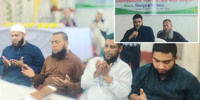 আলোচনা পর্ব শেষে দেশ ও জাতির মঙ্গল কামনা করে বিশেষ মোনাজাত করা হলে মোনাজাত পরিচালনা করেন হাফেজ মাওলানা মাহবুবুর রহমান।